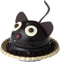 キャラメル:自家製キャラメルソースをたっぷり使ったキャラメルクリームの上に、愛らしい黒猫のチョコレートを飾りました。