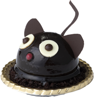キャラメル:自家製キャラメルソースをたっぷり使ったキャラメルクリームの上に、愛らしい黒猫のチョコレートを飾りました。